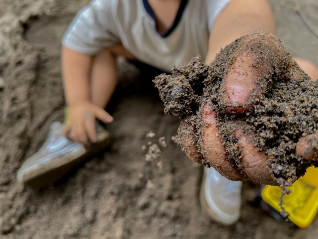 「砂遊びをすると足や手が汚れるからいやだな」と親が思っていると、子どもは親の顔色を伺って「あんまりよくないのかな」と遊びに集中できないこともあります。砂や泥を触ること自体を嫌がってしまう子もいます。