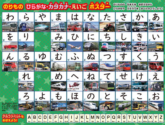 のりものの写真と名前を通して、ひらがなを覚えられるポスターです。カタカナ・アルファベット表もついています。
