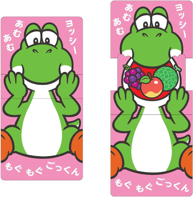 舌を引っ張ると……ぺろーん! マリオの「かお」が動かせる絵本『かおマリオ』に続き、小さなお子さまがさわって・うごかして・発見できる、新しいしかけ絵本『ぺろぺろヨッシー』が小学館より発売されました。