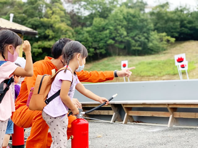 水消火器を使い、的を倒そう!消火器の使い方を学べるアクティビティです。