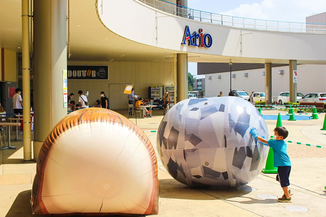 防災クイズに答えて、瓦礫(大玉)を転がそう!子どもに大人気のアクティビティです。