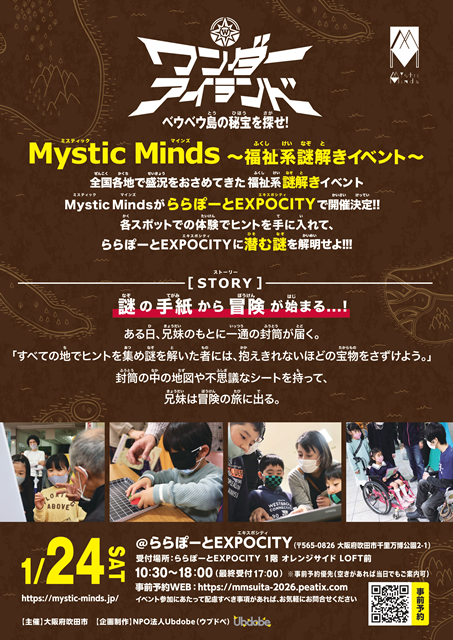 全国各地で盛況をおさめてきた福祉系謎解きイベントMystic Mindsが、ららぽーとEXPOCITYで開催決定!!各スポットでの体験をヒントに福祉の情報を手に入れて、ららぽーとEXPOCITYに潜む謎を解明せよ!!!