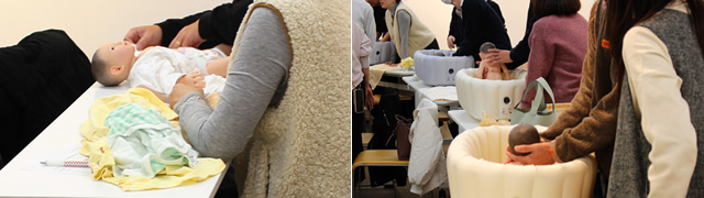 新生児用肌着の種類とお着替えを赤ちゃん人形を使って実際に体験。大人の洋服と違い、肌着の種類や紐が多いことに戸惑う方もいらっしゃいました。