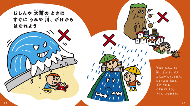防災の心構えから災害発生時の正しい行動を、子どもにもわかりやすく、覚えやすい「35のルール」にまとめました。さらに、ルールを復習できる「すごろく風チェックリスト」や、いざというときに役立つ「防災ポーズ集」、「非常持ち出し袋」に入れるべきもののリストも掲載。