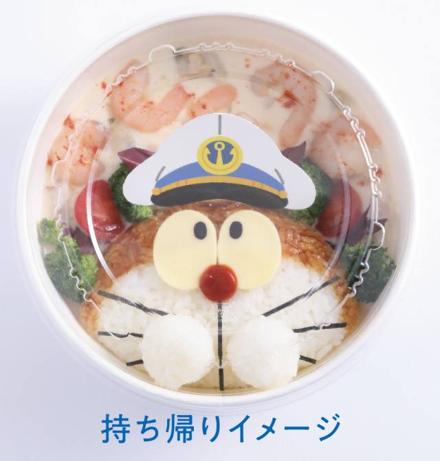 『映画ドラえもん 新・のび太の海底鬼岩城』をイメージした海の幸のクリームシチューです。ごはんで作るドラえもんのフェイスに、鍋で作るクリームシチューとカラフルな野菜を盛り付ければ出来上がり!ランチボックスに詰めてお持ち帰りします。カメレオンぼうしのピックは先着順なのでお早めに!