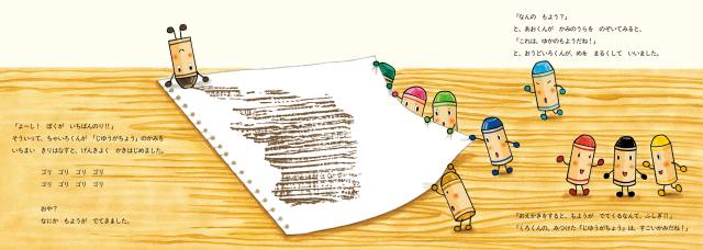 凹凸のあるものの上に薄い紙を置き、クレヨンなどでこすり、表面の模様や形状を写しとる絵画技法です。『くろくんたちのすてきなおえかき』では、フロッタージュの技法で、くれよんたちがさまざまな絵を描いていきます。
