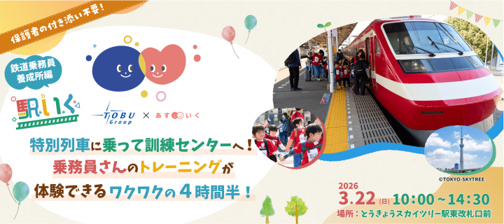 「駅いく」で今回訪れるのは、運転士や車掌が安全運行のための訓練を行う施設で、一般公開される機会がほとんどない、東武鉄道の鉄道乗務員養成所です。子どもたちは、運転士の訓練用シミュレーター見学や車内アナウンス体験、鉄道の仕事について学ぶプログラムなどを通じて、鉄道の裏側やプロの仕事を学びます。