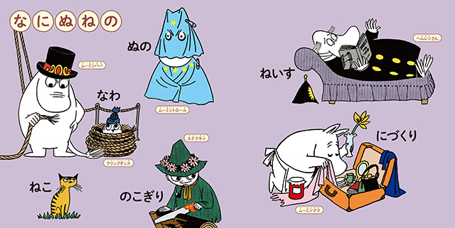 「あ」はミムラ夫人が編んでいる「あみもの」、「い」はスノークのおじょうさんが運んでいる「いた」、それに「いぬ」…ムーミン谷のおはなしに登場する、いろいろな「もの」を「あいうえお」順にとりあげました。