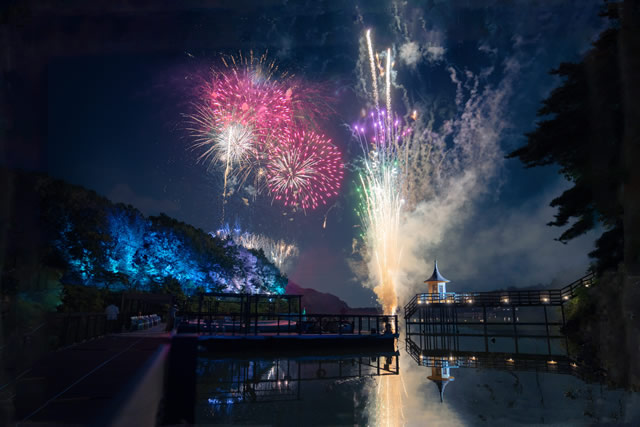 迫力満点!「湖上のテラス」で花火のご鑑賞スタート!