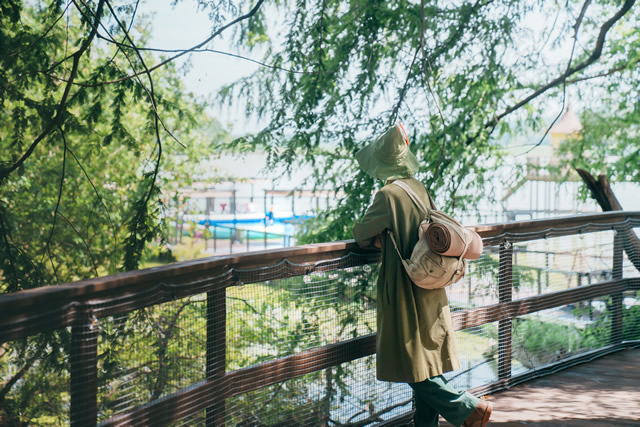 湖岸から「湖上のテラス」へ続く約40メートルの木道は、湖と木々を楽しめる雰囲気のある散歩道です。そこへ、ムーミン谷エリアをお散歩しているスナフキンが、気まぐれにこの木道までぶらりと遊びにやってくることになりました。運が良ければ、周囲の自然と調和した美しい景観の中をスナフキンと一緒に歩いたり、ハーモニカの演奏を聴けたりと、物語のワンシーンのような思い出に残る一枚を撮影できます。