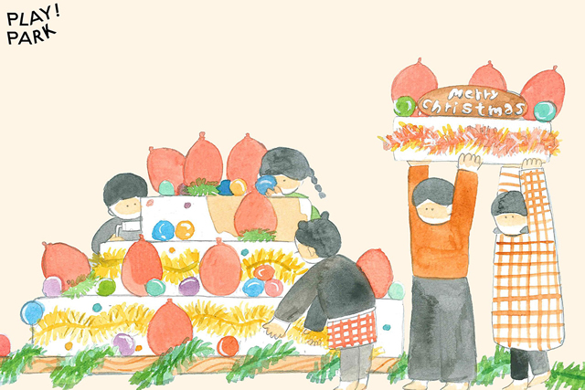 PLAY! PARKがお届けする今年のクリスマスは、“わくわくなクリスマス支度”がテーマです。巨大なケーキのおみこしを作ってパレードするイベントや、自分自身がオーナメントになって遊べるフォトスポットなど、少し奇妙だけど可愛い内容が盛りだくさん。年齢別に、6つのあそび・ワークショップが楽しめます。