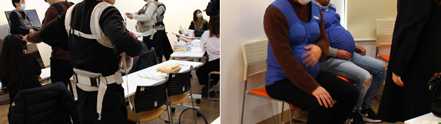 妊娠8〜9か月の重さを再現したジャケットを着用し、足元の見えにくさや立ち座りのしづらさを体験。実際にジャケットを着用し、マットに寝転がってみた参加者は、思うように動けないことに驚いていました。
