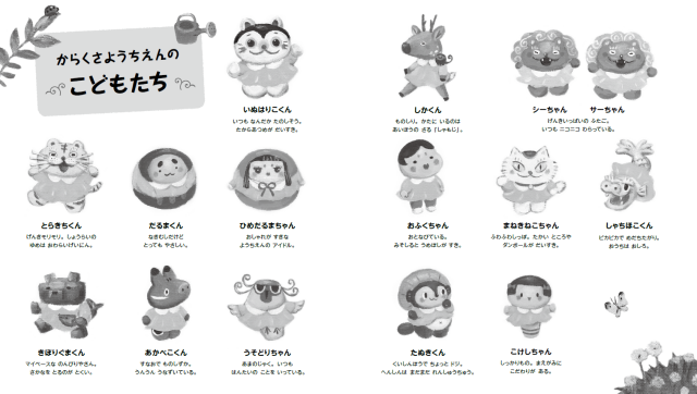 キャラクターの紹介は見返しに掲載されています。紹介を見ながら本書のページをめくれば、「こんなところにもこの子が!」と見つける楽しさも。気づいたら、"推しキャラ"ができていること、間違いなし。