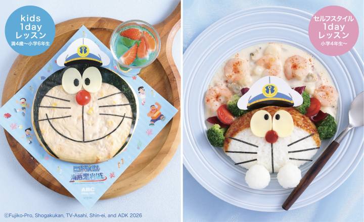 『映画ドラえもん 新・のび太の海底鬼岩城』の公開を記念し、1回きりの料理教室1dayレッスンを3月・4月に開講します。4歳からの子どもを対象とした「kids1dayレッスン」と、小学4年生から大人を対象とした、動画を見ながら一人で作り上げる「セルフスタイル1dayレッスン」をそれぞれ開講し、映画の世界観をお楽しみいただきます。