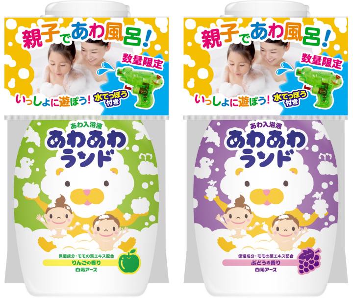 「あわあわランド」は親子の大切なコミュニケーションの場であるバスタイムが楽しくなる液体タイプの泡入浴液です。ご自宅で手軽にふわふわな泡のお風呂を楽しむことができます。今回、お子様にもっと楽しい時間を過ごしてもらうため、水てっぽうのおまけを付けた限定企画品を発売します。