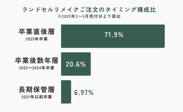 2025年3月〜5月に受付したランドセルリメイクでは、2025年3月ご卒業の方が全体の71.9%と最も高い割合となりました。