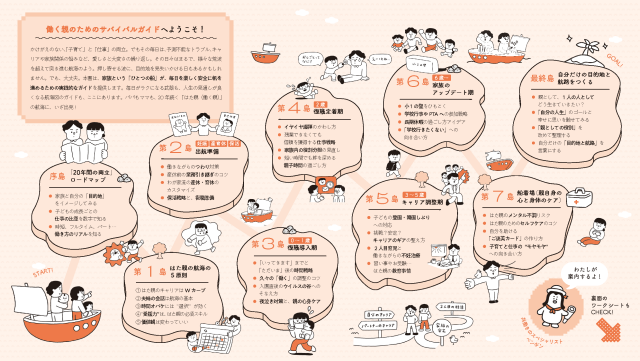 本書では、両立の20年間を「航海」にたとえ、家族という「ひとつの船」で荒波を一つひとつ攻略していきます。長期間にわたる航海を、数年先を見通しながら計画できる構成です。