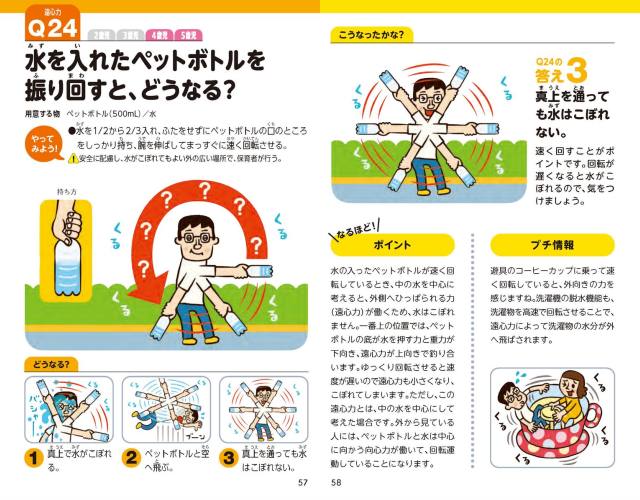 全部で66問もある科学あそびは、ペットボトル、紙、水など、身近な素材を使ったものばかり。特別な道具や準備は必要ないので、忙しい保育現場はもちろん、ご家庭でも手軽に実践可能です。子どもに「やってみたい!」という気持ちを起こさせるだけでなく、思考力や非認知能力が自然に養われるのも、本書ならではのうれしいポイント。持ち運びにも便利なB6のコンパクトサイズなので、いつでもどこでも、お子さまとご一緒に楽しんでいただけます。