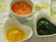 離乳食をはじめて1ヶ月経ち、少しずつ食べられる食材も増えてきたので、彩りがよい組み合わせになるように心がけています。彩りのよい食事は栄養バランスもよいそうです。